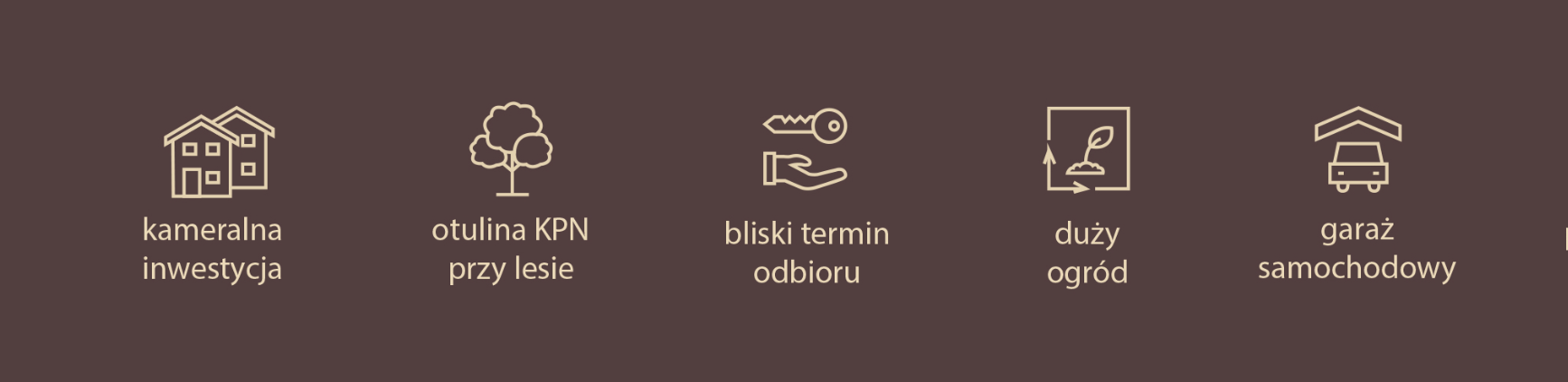 Zaprojektowane przez doświadczonych architektów wnętrza lokali cechuje otwarta przestrzeń z dużymi przeszkleniami na ogród i pięknym widokiem na drzewa. Teren otoczony zielenią, co nadaje inwestycji kameralnego stylu. Każdy lokal posiada ogród do własnej dyspozycji. Przesuwne okna na ogród dodatkowo otwierają przestrzeń i nadają nowoczesności. Można tu odpocząć od pośpiechu i wielkomiejskiego zgiełku bez konieczności rezygnowania z wygód i atrakcji, które oferuje bliskość Warszawy